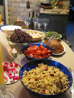 Our feast~ Mushroom pie, green beans with garlic, meatloaf (wrapped in bacon), tomatoes in vinaigrette, brown rice pilaf (with carmelized onion, almond slivers and craisins, with a hint of orange), and juicy miniature grapes.